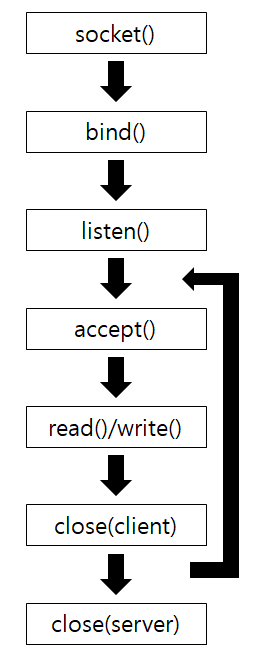 이렇게 왼쪽과 같은 구조로 서버가 동작하게 되면, 비록 한 번에 한 클라이언트이지만 연결 요청한 모든 클라이언트에게 약속한 서비스가 가능하게 됩니다. 나중에 프로세스와 스레드에 대해서 공부를 하고 나면, 동시에 여러 클라이언트에 대한 처리를 할 수 있게 됩니다.
