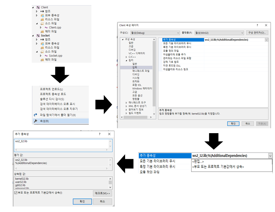 이게 귀찮다면 #pragma comment(lib, "ws2_32.lib")만 헤더파일 밑에 넣어주면 됩니다.