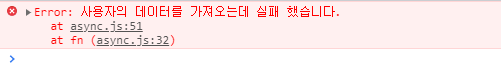 어쨌든 성공적으로 getUser 함수의 실행이 완료되면 결과창에 출력 될 것이고, 오류가 나게 되면 제어 흐름이 catch 문으로 가기 때문에 빨간색으로 된 다음과 같은 메시지를 볼 수 있습니다.