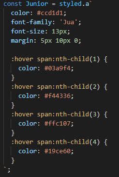 저는 각각의 글자를 span으로 감싸서 색깔을 여러 가지로 줄 수 있겠다는 결론을 내려서 왼쪽과 같이 구현을 했습니다. "쥬니어"단어는 서로 다른 색깔이 필요하니 별개의 span태그로 감싸서 비슷한 색깔을 적용했습니다. 그리고 "네이버"단어는 동일한 색깔이 필요해서 하나의 span태그로 감쌌습니다.